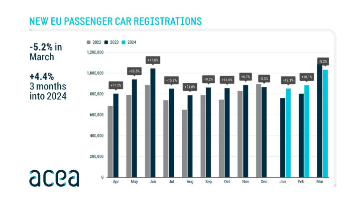 欧盟市场也存在相同的发展趋势,在2022年和2023年的2年时间里,纯电动和插混的市场份额都创下新高。不过,到了2024年开始,欧盟31国的表现为,同比下降 2.2%,纯电同比下降 1.3%,混动同比下降 5.5%。