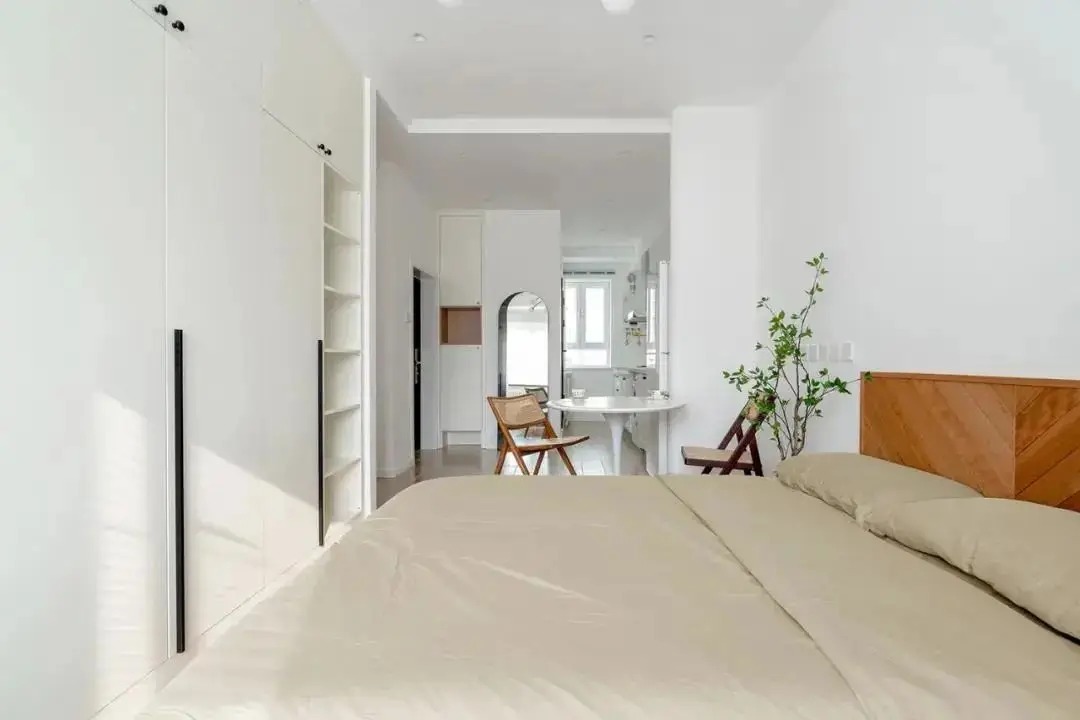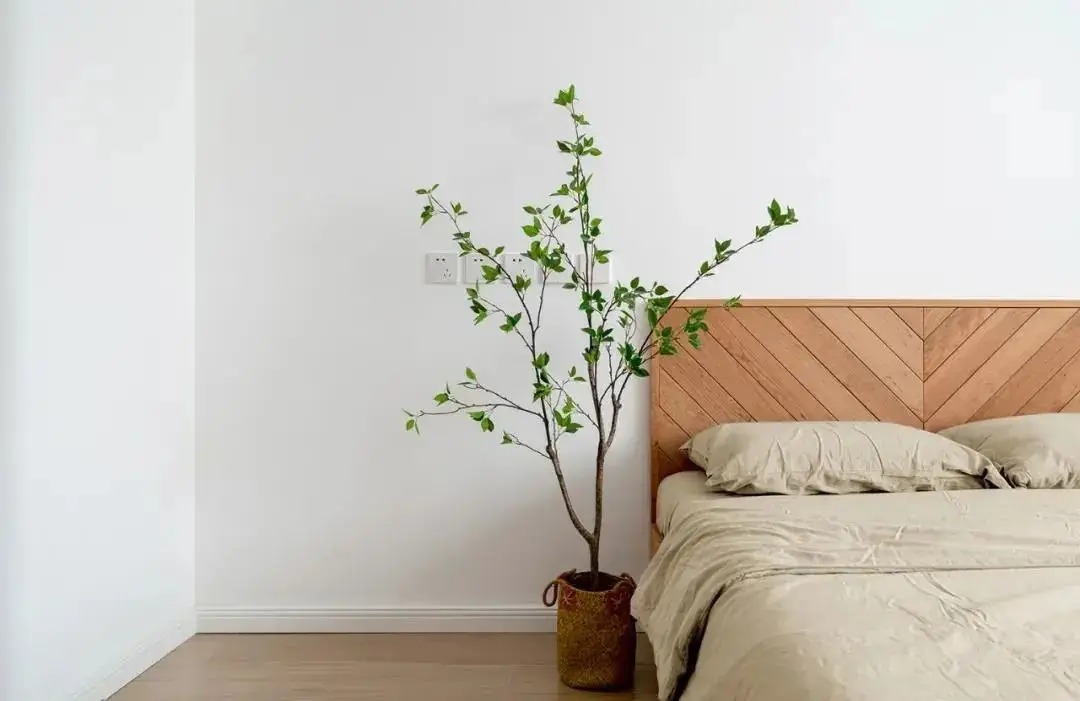 卧室装饰不多,白色背景墙搭配舒适温馨的实木大床,米色床品与小绿植搭配,营造出自然轻松健康的睡眠氛围。