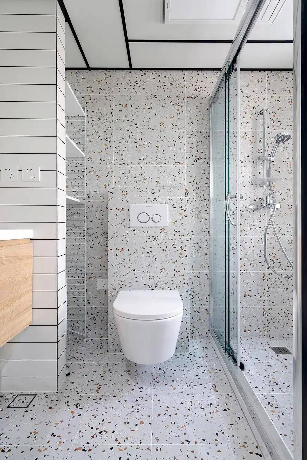 卫生间壁挂式马桶视觉轻盈,无拥堵感且无卫生死角。淋浴区统一水磨石砖,营造延伸空间感,玻璃隔断划分干湿分区。