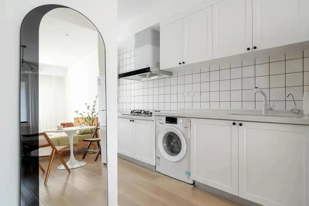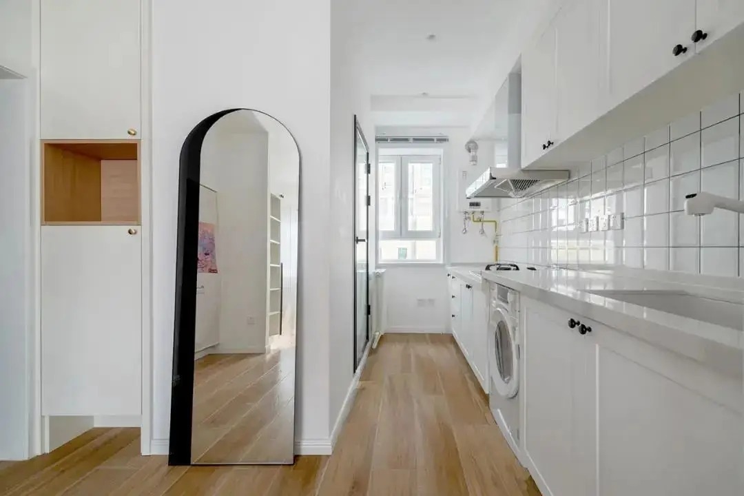 厨房在玄关左转处,靠墙定制一整排到顶白色橱柜,搭配白色小方砖墙面,时尚大气又清新。台面高低台设计,使用更方便,还将洗衣机内嵌其中。