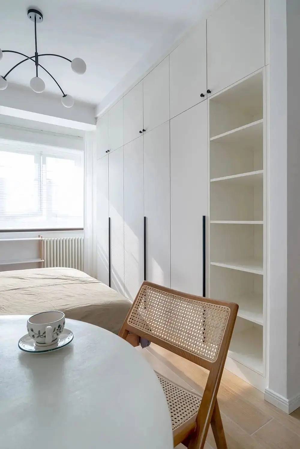 床尾靠墙定制一整面墙白色到顶大衣柜,上方收纳不常用衣物或换季被子,中间为挂衣区,方便收纳。