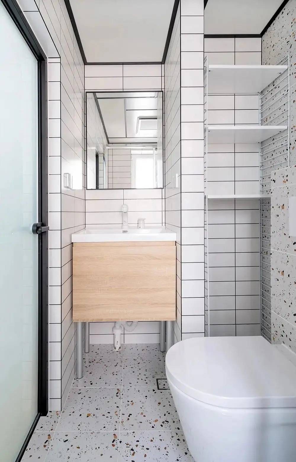 卫生间用两种规格瓷砖铺贴,水磨石砖搭配长条小白砖,视觉上划分区域。洗手台与镜柜用于简单收纳,一边置物架可收纳浴巾等。