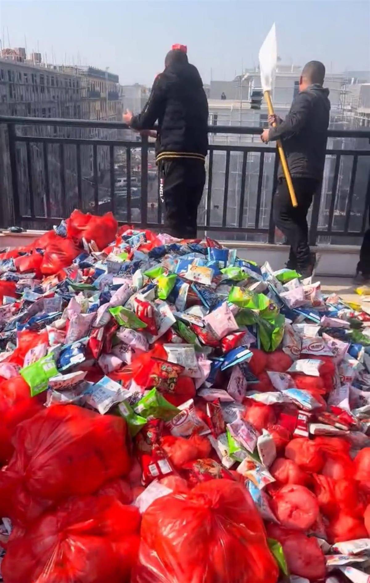 1月8日,浙江义乌一段“新房上梁抛撒糖果零食”的视频走红,收获超36万点赞。视频画面里,新房楼顶被各式各样的糖果、零食堆得满满当当,十几名男子站在楼顶,有的徒手大把抛撒零食,有的干脆用铁锹铲起零食往下扬。更令人忍俊不禁的是,楼下的村民们人手一张比人还高的渔网,仰头对准楼顶,稳稳兜住落下的喜礼。
