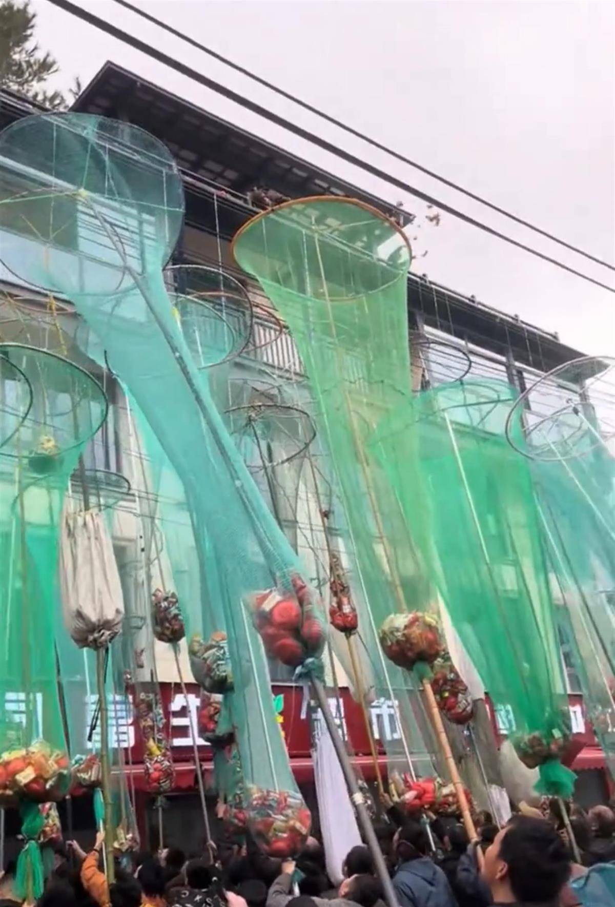 1月12日,当地一名村干部向极目新闻记者证实,用渔网接喜是近几年来兴起的新方式。他介绍,当地新房建好后,户主会择黄道吉日举行上梁仪式,并准备价值数万元的礼品抛撒,通常包括喜糖、零食、馒头和香烟。